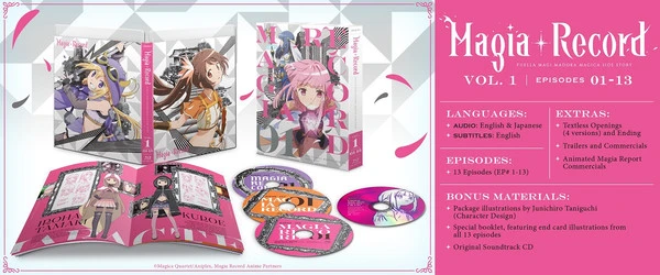 Magia Record: Puella Magi Madoka Magica Side Story Volume 1 contains episodes 1-13 of the anime directed by Gekidan InuCurry and includes a Special Booklet featuring end card illustrations from all 13 episodes and the Original Soundtrack CD.