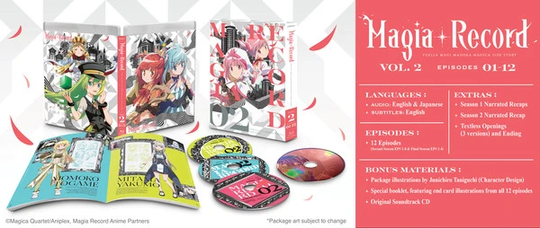 Magia Record: Puella Magi Madoka Magica Side Story Volume 2 contains Season 2 episodes 1-8 and episodes 1-4 from the Final Season of the anime directed by Gekidan InuCurry and includes a Booklet featuring end card illustrations from every episode and a CD Soundtrack.