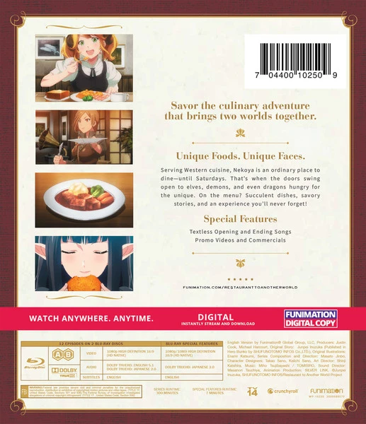 Restaurant to Another World Season 1 Essentials contains episodes 1-12 of the anime directed by Masato Jinbo.