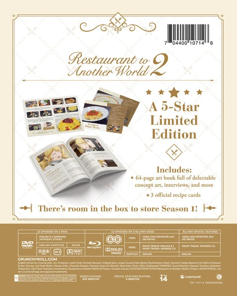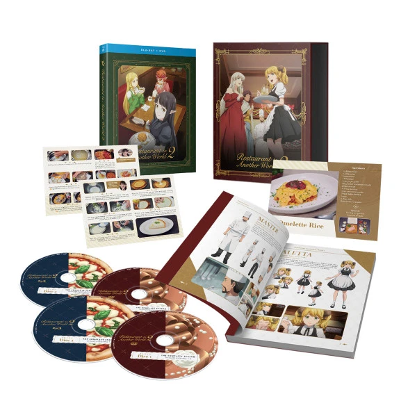 Restaurant to Another World Season 2 Limited Edition contains episodes 1-12 of the second season of the anime directed by Masato Jinb and includes a 64-page art book featuring concept art, interviews, and more, and 3 official recipe cards, all housed in a specialty print box with room to store Season 1.