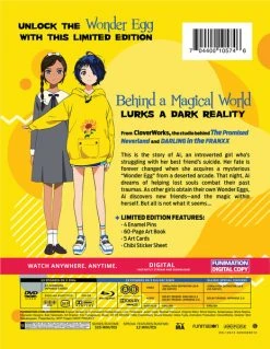 Wonder Egg Priority Limited Edition Blu-ray/DVD contains episodes 1-13 of the anime directed by Shin Wakabayashi and includes 4 Enamel Pins, 5 Art Cards, a 60 Page Art Book, and a Chibi Sticker Sheet all housed in a Collector’s Box.