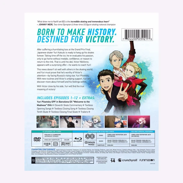 Special Features: Yuri Plisetsky GPF in Barcelona EX “Welcome to the Madness” OVA, Eleventh Skate Commentary, Textless Opening Songs, Textless Closing Song, Textless Closing Tenth Skate, Textless Closing Final Skate, Trailers