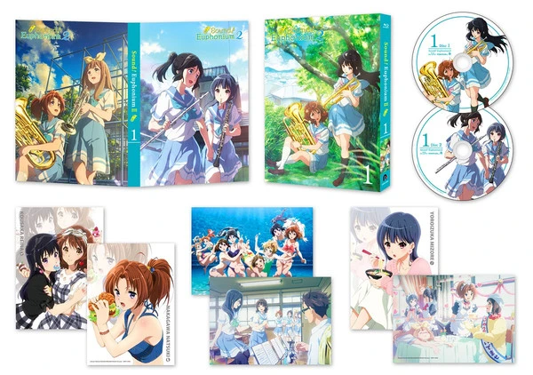 Sound Euphonium 2 Volume 1 Blu-ray contains episodes 1-6 of the anime directed by Tatsuya Ishihara, plus 6 illustration cards.