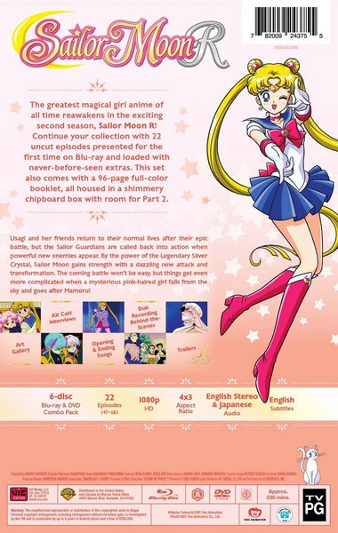 Sailor Moon R Set 1 Limited Edition contains episodes 47-68 of the anime directed by Junichi Sato and Kunihiko Ikuhara, plus a 96-page full-color booklet, housed in a shimmery chipboard artbox.